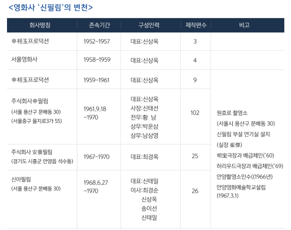 신상옥감독기념사업회 홈페이지에 나와있는 신상옥 감독님이 대표로 있던 신필림은 1961년부터 1970년까지 많은 작품을 세상에 내놓습니다.
